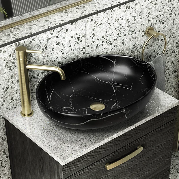 The eye catching luxury Arezzo matt black marble effect counter top basin has a stylish contemporary curved oval shape, perfect for creating a boutique feel in your bathroom. Designed to be mounted onto a worktop console and is best complemented with a high rise basin mixer or wall mounted tap. Manufactured from high quality vitreous china with a painted black marble effect finish. Some small dimensional variation may occur due to manufacturing tolerances. Waste not included.
