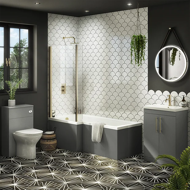 The Arezzo L-shaped shower bath, supplied with MFC matt grey panel, the Arezzo modern square shower bath allows showering and bathing space in the bathroom. This 1700mm shower bath comes supplied with a brushed brass profile hinged 6mm glass bath screen and it’s matt grey front panel have been designed to match the Arezzo Matt Grey Furniture Range. All of our shower baths are available in left or right hand configuration, and are the new ideal solution for families looking to add a little luxury, whilst keeping an eye on space.