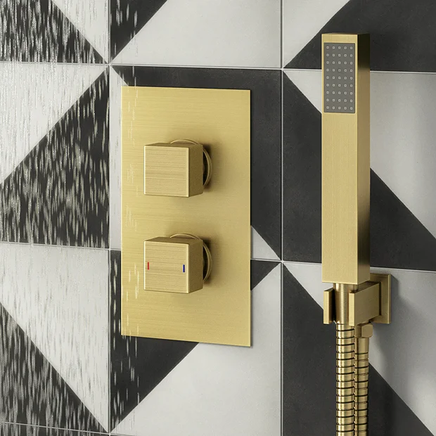 The Arezzo Concealed Thermostatic Shower Valve with Diverter features a striking geometric design with a contemporary brushed brass finish. Offers thermostatic showering via two easy-to-operate controls for temperature and flow. Designed to control two outlets e.g. fixed head/slide rail kit, fixed head/body jets or slide rail kit/body jets.
