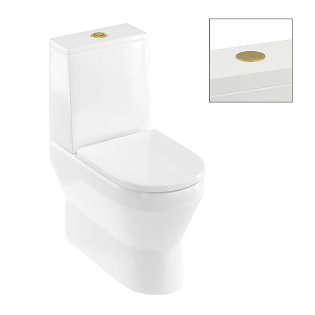 Britton Curve2 Rimless Close Coupled Back To Wall Toilet with Brushed Brass Flush Button + Soft Close Seat