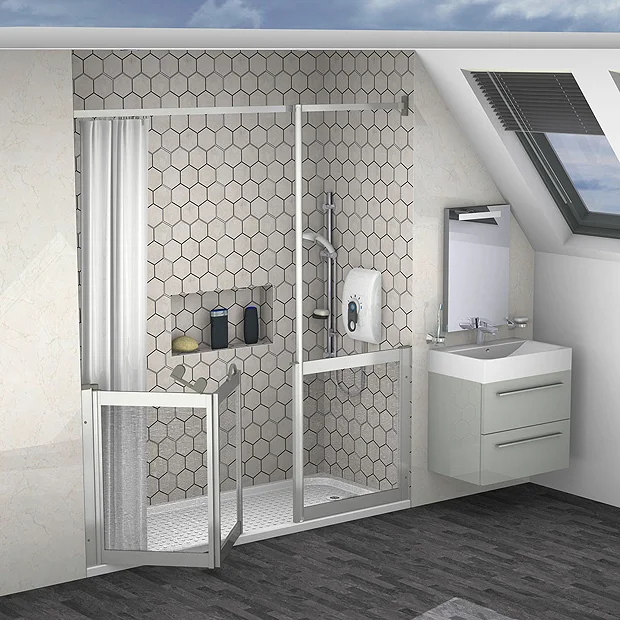 Designed for independent & assisted showering to help retain water in the shower area, the Milton Front Access Half Height Bi-Fold Door Hinged from Wall & Fixed Panel is ideal for use on shower trays or in wetrooms providing ease of use & installation. The doors are glazed with PET environmentally friendly impact resistant glazing as standard. The flip over latch will prevent door movement should a carer lean against them & will provide a more rigid enclosure while the rise & fall hinges lift the door by at least 10mm & are easy to operate & highly manoeuvrable. The Easy to grip ‘D’ handles supplied for users with limited strength. Supplied as standard with a 2000mm drop antibacterial protected shower curtain and rail.
