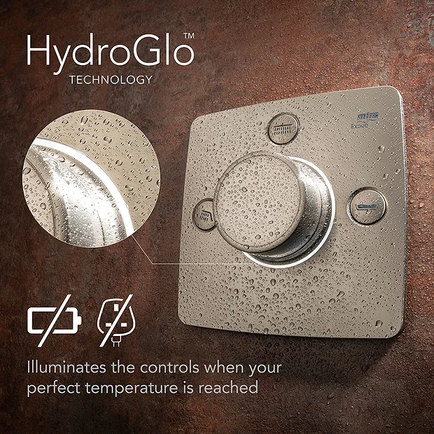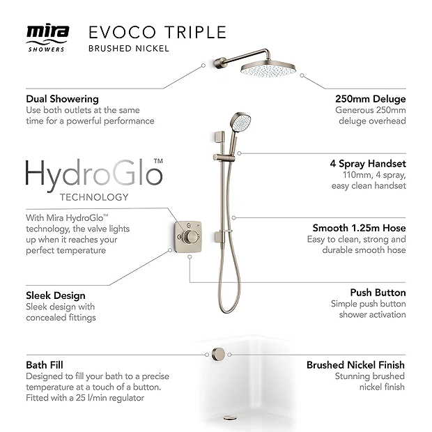 Ultra-sleek and fully-concealed, the Mira Evoco Dual Outlet Brushed Nickel Thermostatic Mixer Shower with Bathfill creates a refined, sophisticated look and feel. Enjoy style as clean and luxurious as your experience – featuring a fully-concealed shower mixer, indulgent double showerheads and a bath filler. With innovative Mira HydroGlo technology, illuminating at the perfect temperature.