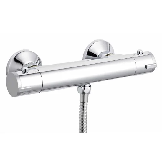 This product features a minimalist chrome bar shower valve with thermostatic control, the valve has a bottom outlet for attaching the shower slider rail kit.