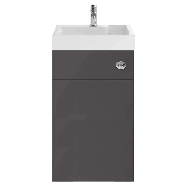 An ideal space saving solution for en-suites and cloakrooms, this 2-in-1 combined wash basin and wc unit utilises the smallest of spaces and creates more space in your bathroom. Made from high quality materials with a stunning sleek gloss grey finish, it compliments any modern bathroom to create a designer look. Comes with a single tap hole Polymarble basin top and dual flush cistern.