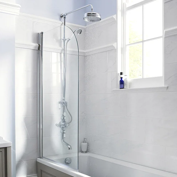 The luxury polished chrome traditional triple exposed valve With spout from period bathroom specialists Old London. Features a beautifully crafted handset, finished in chrome with a white ceramic handle and a chrome shower hose and fixed head. Comes with a built-in diverters. The classically styled thermostatic shower valve has been made from solid brass with a chrome finish and incorporates a built-in anti-scald device for complete peace of mind when showering.