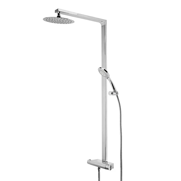 The Breeze Round Exposed Dual Function Diverter Shower System features a useful shelf for all your bathroom toiletries. The shower also boasts an automatic shut down if the cold water pressure should suddenly fail and is limescale resistant. Package includes a thermostatic diverter bar valve with accessory shelf, rigid riser rail, 250mm stainless steel shower head, Air-drive 5 function shower handset, wall mounted brass adjustable handset holder and shower hose. Air-drive handsets are water saving creating an aerated bubble spray that uses less water.