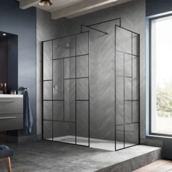 Venice 1950mm Matt Black Abstract Grid Wetroom Screen + Support Arm
