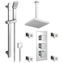 Modern Square Triple Valve With Diverter, Ceiling Mounted Square Shower Head, 4 Body Jets + Slider