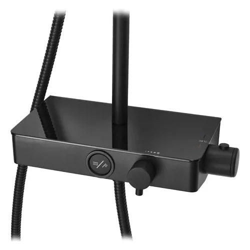 The clean lines of this stunning matte black mixer shower will make an impact in any bathroom. Perfect for either a shower enclosure or over the bath, this truly eye-catching mixer offers contemporary style and great performance. The easy click push button makes it simple to choose between the drench head shower or the shower handset providing flexible showering for all the family. Features a stylish and handy contrasting gloss black shower shelf fitted with safety glass.